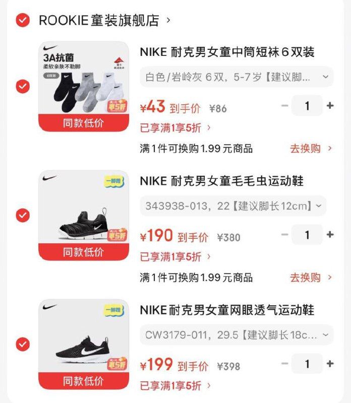 耐克儿童短袜6双装43亓